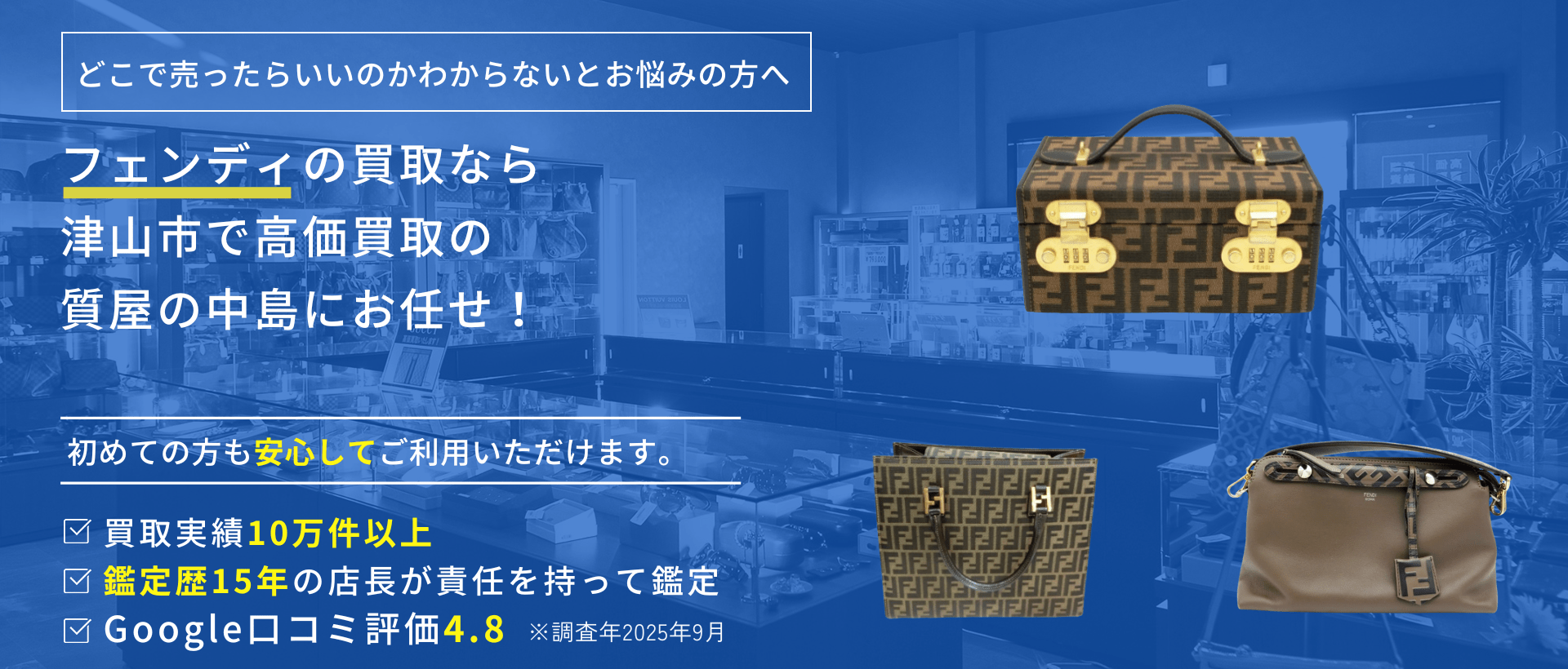 フェンディの高価買取は買取実績10万件以上・鑑定歴15年の店長が責任を持って鑑定・津山市の質屋で口コミ評価4.8と確かな実績と経験をもつ質屋の中島にお任せください!