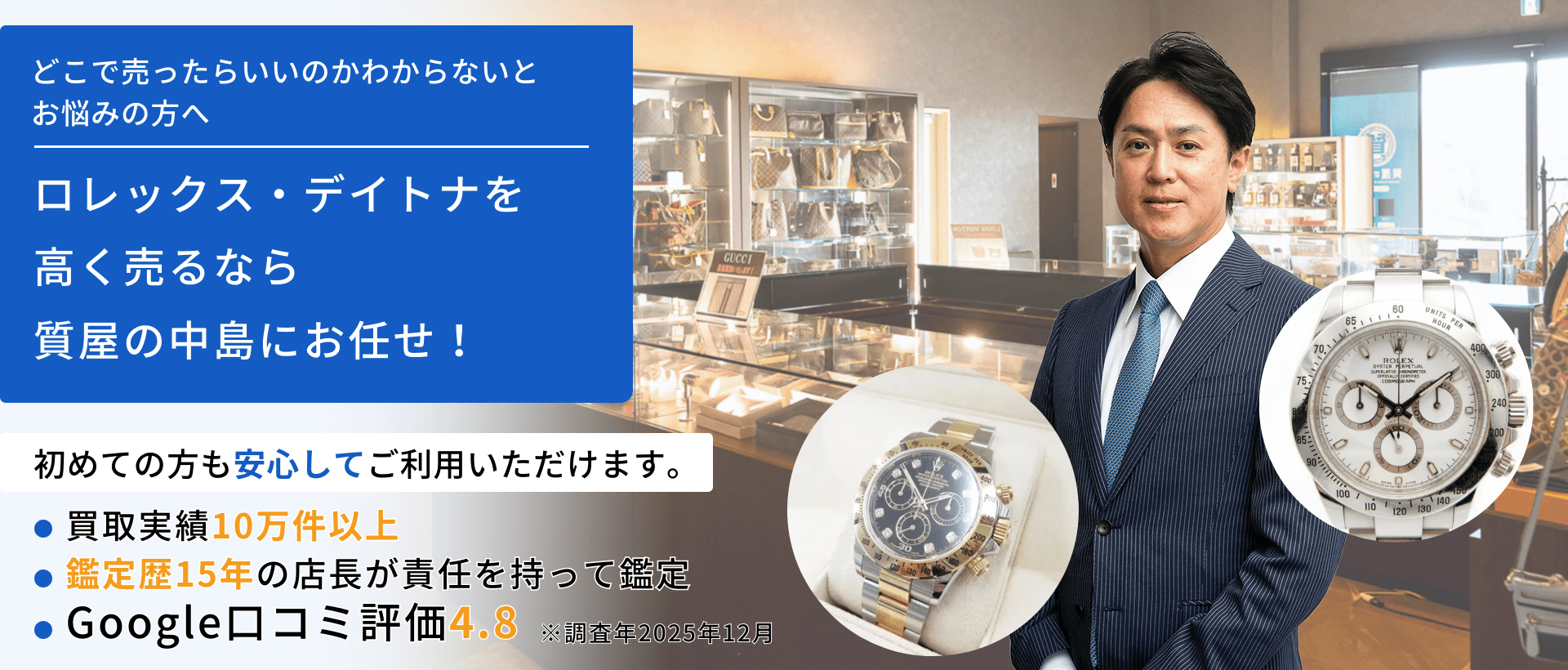 ロレックス・デイトナの質預かり・高価買取は買取実績10万件以上・鑑定歴15年の店長が責任を持って鑑定・津山市の質屋で口コミ評価No.1と確かな実績と経験をもつ質屋の中島にお任せください!