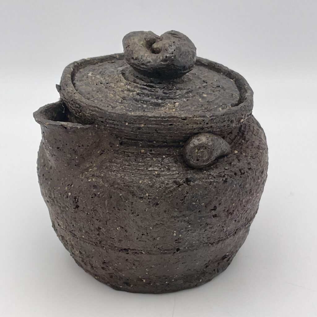 ざらついた黒っぽい肌合いは、津山の鉄分を多く含む土の個性を引き出しており、手に馴染む宝瓶として非常に高い評価を受けています。