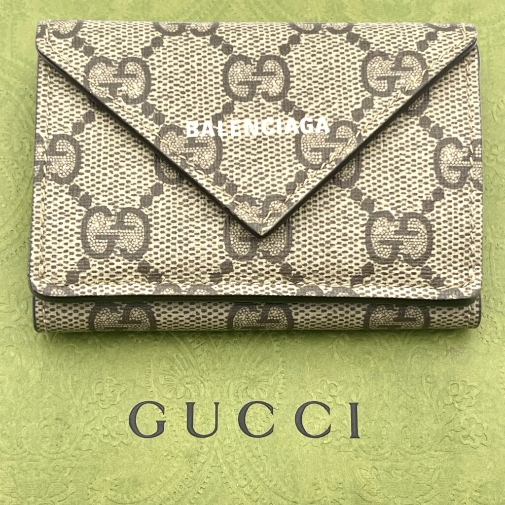 バレンシアガの代名詞である『ペーパー ミニウォレット』のシルエットに、グッチを象徴するGGスプリーム キャンバスを融合させたこのモデルは、両ブランドのアイデンティティがぶつかり合う、まさに記念碑的なアイテムです。