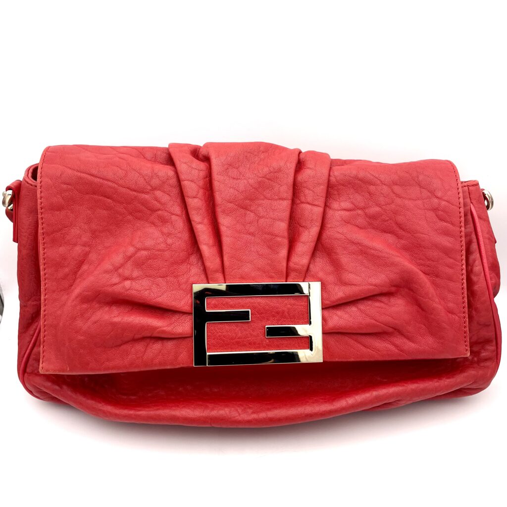 フェンディの象徴である『FFロゴ』を大胆にあしらったバックルと、高級感のあるチェーンショルダーが組み合わさった『ミア』は、フェミニンさと力強さを兼ね備えた人気のラインです。特にお持ちいただいたレッドカラーは、コーディネートの主役になる華やかさがあり、中古市場でも根強い需要がございます。